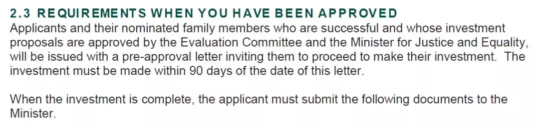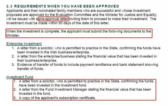 除了再次重申不得融資以外,此次法案更新還首次提到了“預批復”環(huán)節(jié),即投資人的投資申請由評估委員會(Evaluation Committee)和愛爾蘭司法和平等部長( The Minister for Justice and Equality)批準后將獲得“預批函”(Pre-approval letter)。