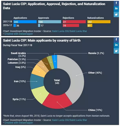 統計結果顯示,圣盧西亞投資入籍計劃上個財年(2017-2018財年)的表現相較于上個財年(2016-2017財年)突飛猛進!該計劃在上一個財政年度僅收到36份申請,其中僅17份獲批,批準率不達50%。總而言之,圣盧西亞自成立以來已有343名申請者拿到公民身份。其中,來自中國的申請者最多。