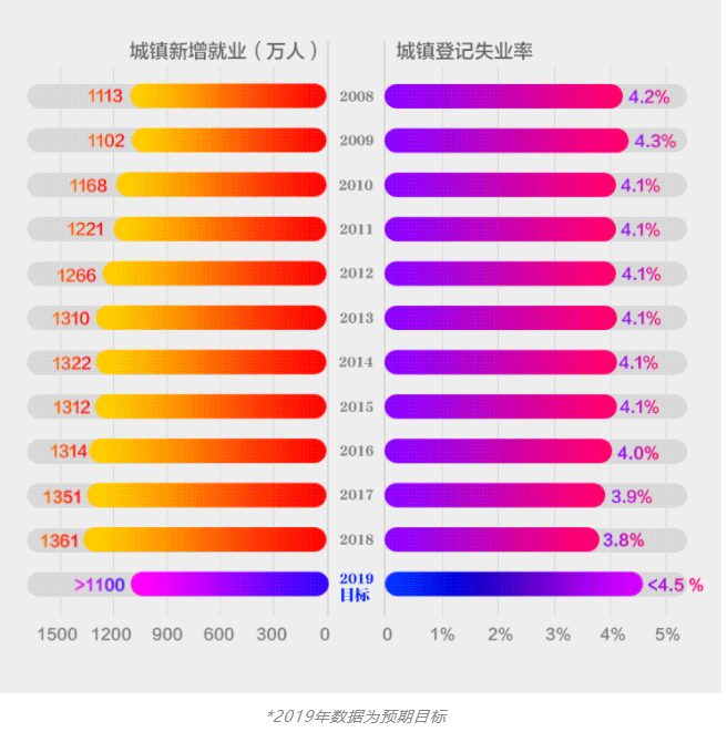 2019年就業形勢如何?政府工作報告中提到今年經濟社會發展的主要預期目標時這樣表述:城鎮新增就業1100萬人以上,城鎮調查失業率5.5%左右,城鎮登記失業率4.5%以內。