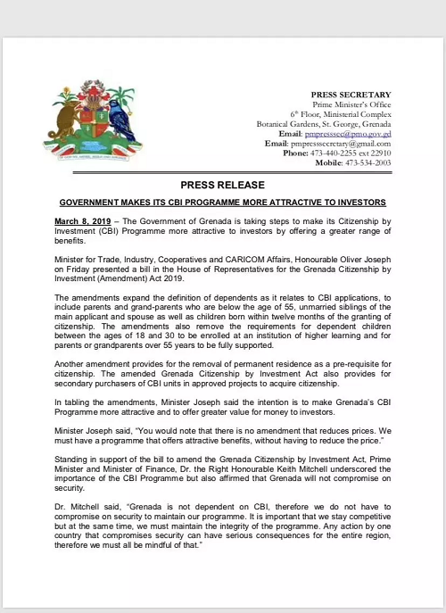 繼2018年9月,格林納達移民新政后,2019年3月8日,格林納達政府表示正在采取措施,希望通過提供更多的福利,使其“投資入籍(CBI)項目”對投資人更具吸引力。