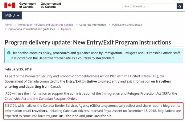 基于2018年12月13日通過的Bill C21法案,加拿大邊境管理局(CBSA)即將實(shí)行收集出入境旅客的管理資料及信息。2019年6月起對陸路進(jìn)出的跨境者生效,2020年6月起對航空出入境者生效。