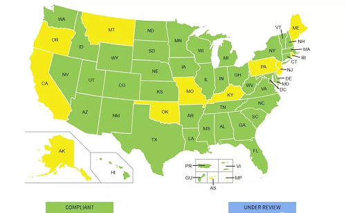 綠色為合格州,該州駕照已經符合 REAL ID 標準,居民可以拿著本州駕照登機,對出行不會造成任何影響。