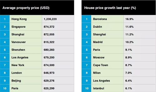 中國香港以平均一套$123萬美元的房價位居榜首。中國香港豪宅的平均價格也是全球最貴,達到$690萬美元。