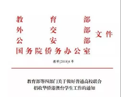 教育部、外交部、公安部、國務院僑務辦公室等四部門就普通高校聯合招收華僑港澳臺學生(以下簡稱全國聯招)作了最新的規定。該規定已從2019年正式開始實施。