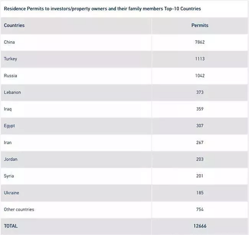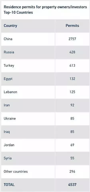 中國以2757份黃金簽證數量穩居第一,占總量超過60%,其次是:俄羅斯、土耳其、埃及、黎巴嫩、伊朗、烏克蘭、伊拉克、約旦、敘利亞。