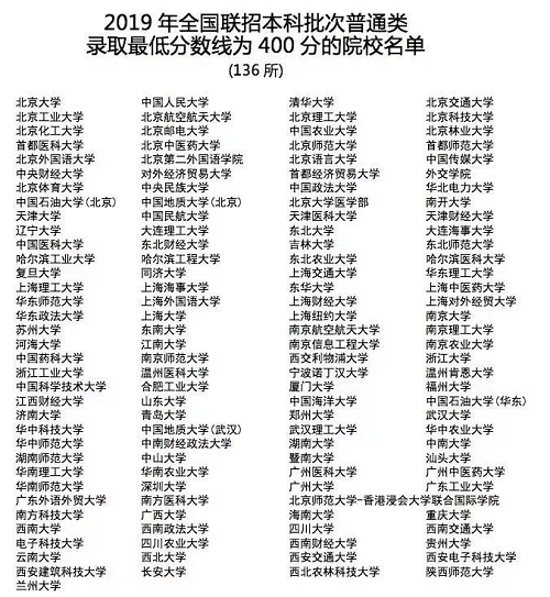 多數985、211重點大學的錄取分數線為400分,清華北大這類頂尖學府也在400分的列表中。