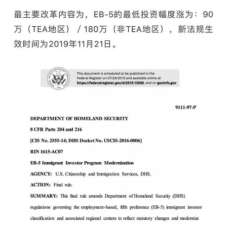 移民局于7月24日發(fā)布EB-5投資移民項(xiàng)目的新法規(guī),這是自1993年以來美國投資移民項(xiàng)目法規(guī)的首次重大修訂。新法規(guī)將于2019年11月21日生效。