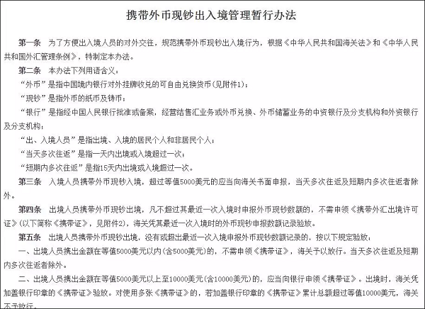 那具體的法律條文是怎樣的呢?《攜帶外幣現鈔出入境管理暫行辦法》第五條規定:攜帶超過1萬美元以上,應當向國家外匯管理局申領《攜帶證》。