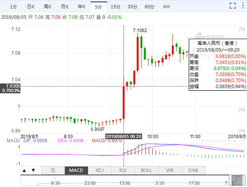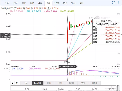 8月5日早9點20分,離岸人民幣“破七”,9點33分,在岸人民幣兌美元也迅速跌破七關口,人民幣在岸離岸雙雙破7,打破了中間價長期保7的平靜。