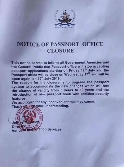 瓦努阿圖移民局(VIS)下的護照辦公室將于2019年7月17日至23日關閉。計劃關閉的辦公室將用于升級