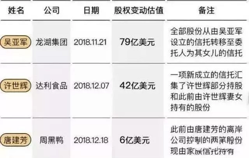 中國頂級富豪的移民路徑和資金走向一直是關注的焦點:比如2018年11月20日至12月31日,僅僅一個多月的時間,龍湖集團董事長吳亞軍、達利食品董事長許世輝以及周黑鴨實控人唐建芳就將超過170億美元(約合1148億人民幣)的財富轉入了離岸信托。