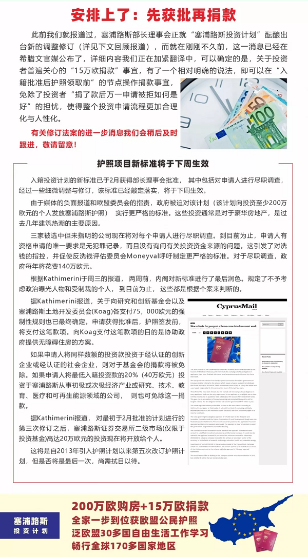 從去年開始,塞浦路斯的投資入籍計劃已經(jīng)過幾次修正,對今年5月生效的塞浦路斯護照問題采用了更嚴(yán)格的標(biāo)準(zhǔn)。