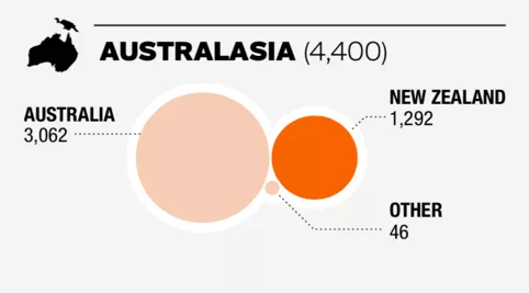 目前大洋洲區(包括澳大利亞、新西蘭與鄰近島國)的超高凈值人士為4400人,其中包括在澳大利亞的3062人,而該地區的超高凈值人士規模將在未來5年內增長22%。