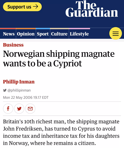 弗雷德里克森于是與挪威稅務部門開始了一場長達2年的談判,2006年,談判未果,弗雷德里克森放棄挪威國籍,以投資購房的方式入籍塞浦路斯,以此避免巨額所得稅和遺產稅。