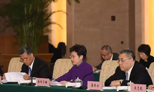 行政長官林鄭月娥11月6日下午在北京釣魚臺國賓館以成員身分出席由國務院副總理韓正主持召開的粵港澳大灣區建設領導小組會議,討論部署下一階段重點工作。政制及內地事務局局長聶德權和行政長官辦公室主任陳國基列席會議。