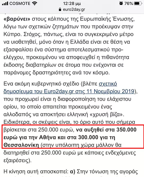 消息顯示,預計此次修改希臘“黃金簽證”所需的最低門檻有以下幾個方面:原本25萬歐元的投資額計劃中,雅典上升至35萬歐元、塞薩洛尼基上升至30萬歐,其他地區(qū)可能會與一些可能的例外保持在25萬歐元。