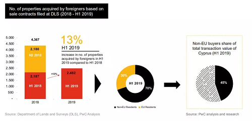 根據普華永道報告顯示, 2019年上半年,海外投資者在塞浦路斯共購買了2482套房產,較2018年上半年增長了13%,其中近70%的海外投資者來自非歐盟國家。