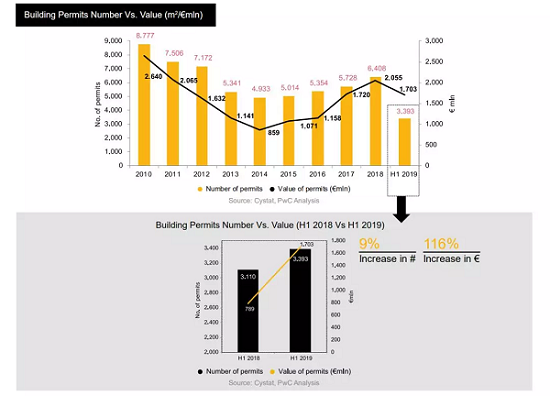 根據數據統計,2019年上半年塞浦路斯政府新發放的建筑規劃許可總數達3393個,相比于2018年上半年的3110個同比增長9%。就總價值而言,2019年上半年政府的所批準的建筑規劃許可總價值相較于2018年上半年,同比增長116%。