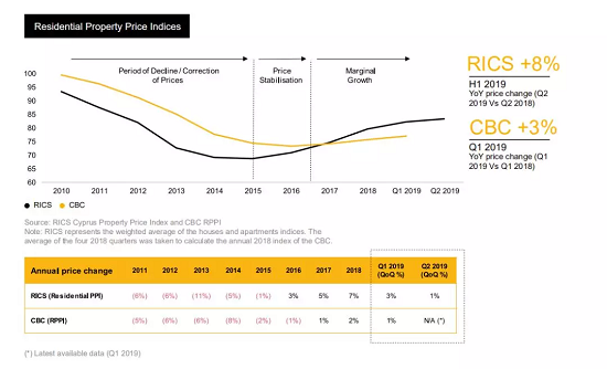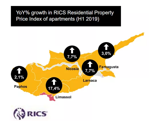 根據RICS指數,利馬索爾住宅價格從2018年第二季度到2019年第二季度上漲了17.4%,拉納卡及尼科西亞住宅價格均上漲了7.7%,帕福斯增長最低僅為2.1%。