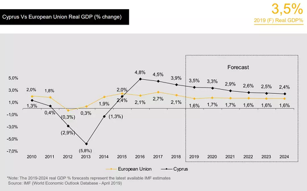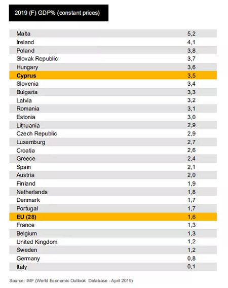 截止到2018年年底,塞浦路斯GDP已連續3年表現出強勁增長,國際貨幣基金組織(2019年4月)預測,繼2018年3.9%的增長率之后,2019年年底塞浦路斯GDP實際增長率將達到3.5%,遠高于歐盟28國平均GDP增長率1.6%,在歐盟國家中排名第六位,保持在歐洲經濟增速最快的國家之列。