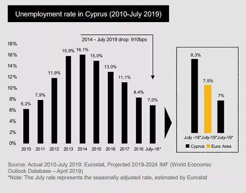 根據歐盟統計局的統計數據,2019年7月,塞浦路斯失業率下降至7%(2018年7月為8.3%),低于歐元區國家7.5%的平均失業率。