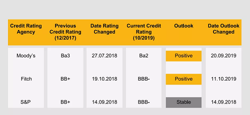 2018年,主要國際信用評級機構將塞浦路斯主權評級提升至投資級。2019年9月和10月,穆迪和惠譽分別將塞浦路斯評級展望由“投機級”提升為“投資級”。