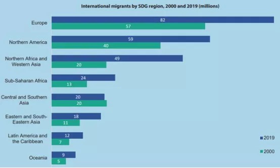 移民數據報告稱,預計截止到2019年全球移民數量將達2.72億,移民人數占全球總人口的3.5%,這些移民人口大多數集中在歐洲(8100萬)和北美(5900萬),其次是北非和西亞(分別為4900萬)。