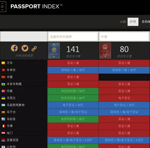 再來看看深受國內高凈值人群歡迎的小國護照圣基茨,它在排行榜中的名列第20位,實力位居前列,可免簽105個國家,落地簽36個國家,需要辦理旅游簽證的國家為57個,流動性分數為141分,在世界范圍內的護照影響力還是相當高的,持有