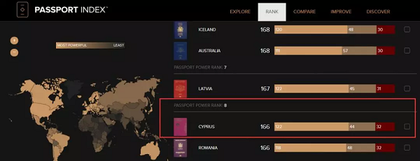 塞浦路斯護(hù)照指數(shù)在該排名中位列第8,持塞浦路斯護(hù)照可以訪問(wèn)166個(gè)國(guó)家,其中122個(gè)國(guó)家免簽證,44個(gè)國(guó)家在抵達(dá)時(shí)獲得簽證。塞浦路斯護(hù)照持有者在獲得簽證后,還可以訪問(wèn)另外32個(gè)國(guó)家。