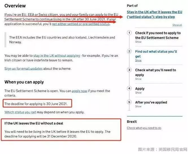 英國(guó)移民局官網(wǎng)顯示,目前《歐盟永居方案》已開(kāi)放申請(qǐng),截止日期是2021年6月30日。但若英國(guó)無(wú)協(xié)議脫歐,則《歐盟永居方案》的申請(qǐng)截止日期為2020年12月30日。