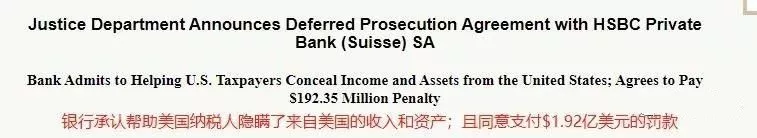 美國司法部近日宣布,匯豐控股的瑞士私人銀行子公司將支付1.924億美元,以了結美國當局對其利用未申報的瑞士銀行賬戶幫助美國富人逃稅一事進行的調查。