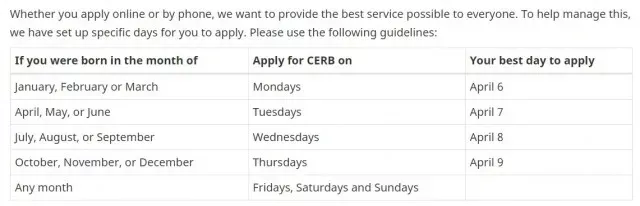 申請緊急抗疫津貼(CERB)的方式有兩種:網上申請或打電話申請,但無論使用哪種方式,都需要提前查詢好最佳申請日期,根據政府官網顯示,申請日期是根據出生月份來劃分的。