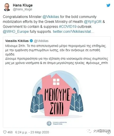 希臘抗疫成果頻頻獲贊,世衛組織高度肯定希臘限制措施世衛組織歐洲辦事處負責人漢斯·克魯格(Hans Clugge)通過Twitter祝賀衛生部和希臘政府總體上采取了“大膽步驟”來遏制病毒的傳播。