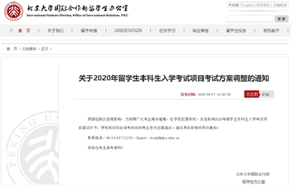 近日,北京大學國際合作部留學生辦公室發布《關于2020年留學生本科生入學考試項目方案調整的通知》,該通知明確宣布:本校決定取消2020年留學生本科生入學考試項目的筆試環節,學校將對符合報名條件的學生進行遠程面試。