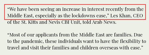 Les Khan解釋說,在疫情期間收到的大多數來自中東地區的申請人都是以家庭為單位的,他們出于疫情的影響因素,更希望通過獲得第二身份擁有靈活跨國走親訪友以及旅行的便利。并且從數據上看,目前辦理圣基茨身份的投資人中,來自中東地區的人數排第一,而來自中國的人數排第二。