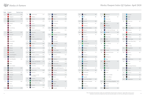 在Henley & Partners(簡稱“H&P”)發布的2020年第一季度的護照指數排名中,圣基茨護照以免簽156個國家和地區排名全球No.26。超高的含金量能為投資人在旅行自由方面提供極大便利。