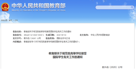 6月10日,教育部發(fā)布了最新《關于規(guī)范我高等學校接受國際學生有關工作的通知》,依法對接受國際學生申請進入我國高校本專科階段學習作出了補充規(guī)定。