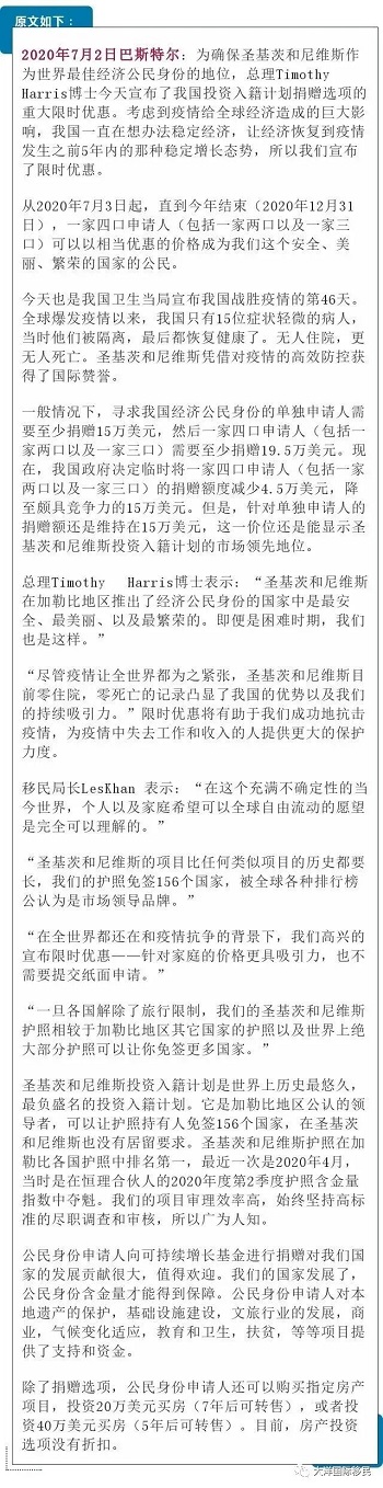 圣基茨和尼維斯移民局上周五發布通知,宣布圣基茨和尼維斯投資入籍計劃針對一家四口家庭的捐贈要求從19.5萬美元降至15萬美元,直到今年結束,發布之日立即生效。