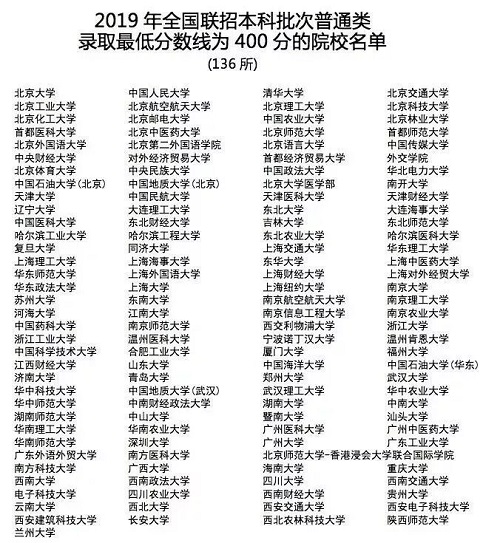 多數(shù)985、211重點(diǎn)大學(xué)的錄取分?jǐn)?shù)線為400分,清華北大復(fù)旦這類頂尖學(xué)府也在400分的列表中。具體名單如下: