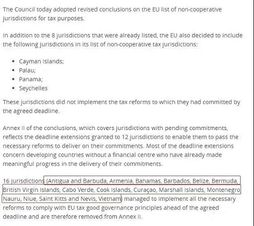 同時(shí),16個(gè)國家以及地區(qū)(安提瓜和巴布達(dá)、亞美尼亞、巴哈馬、巴巴多斯、伯利茲、百慕大、BVI英屬維爾京群島、佛得角、庫克群島、庫拉索、馬紹爾群島、黑山、瑙魯、紐埃、圣基茨和尼維斯、越南)遵守歐盟稅收原則進(jìn)行改革,被移除灰名單,正式成為白名單的成員之一。