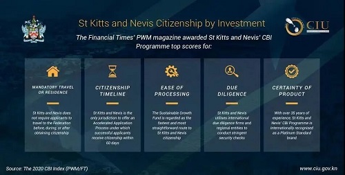 今年9月份,在《金融時報》出版的《專業財富管理》雜志中,圣基茨CBI也被評為全球最佳的公民身份投資計劃之一,是獲取公民時間最快的,提供最確定的、最具家庭吸引力的CBI計劃之一。