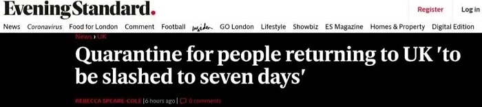 隨著疫情的變化,英國政府的入境隔離政策也有所調整。英國政府正在計劃徹底改革入境隔離規定:從隔離名單上的國家和地區返回英國的旅行者的隔離時間從14天削減到7天。