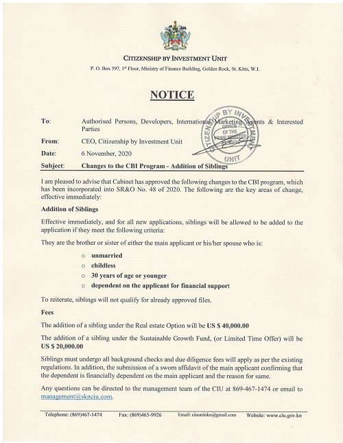 圣基茨和尼維斯移民局發(fā)布通知,圣基茨投資入籍計(jì)劃正式將主申請(qǐng)人的兄弟姐妹納入法案中。這意味著,兄弟姐妹可隨主申請(qǐng)人一道申請(qǐng)圣基茨和尼維斯身份。