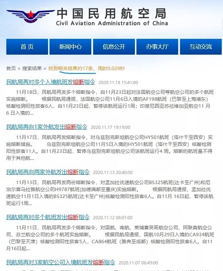 而慢慢恢復的國際航班,遭遇到了大量熔斷。從今年6月14日民航局熔斷了第一個航班后,已經接連發出了至少17條熔斷指令。11月18日最為嚴重,一天熔斷了10個航班。
