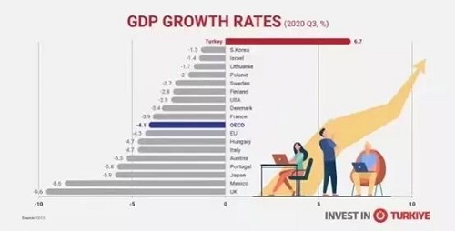 土耳其第三季度國內生產總值(GDP)同比增長6.7%,至1.4萬億土耳其里拉(1974億美元),排名全球第一,是疫情期間經合組織成員國唯一一個逆勢增長的國家!同期,在第三季度的房地產交易增加2.8%,農業增加6.2%,建筑業增加6.4%,工業增加8%,信息和通信活動增加了15%,金融和保險活動更是大增了41.1%。