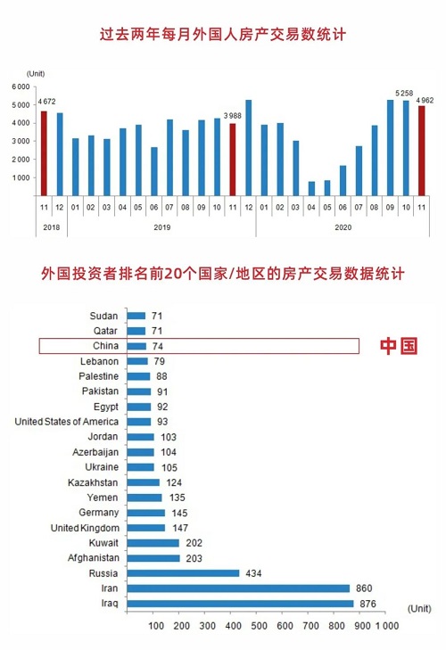 2020年11月中國投資者房產交易為74宗,位列外國投資者第18位(其中伊拉克第1,俄國第3,英國第6,德國第7,美國13)。