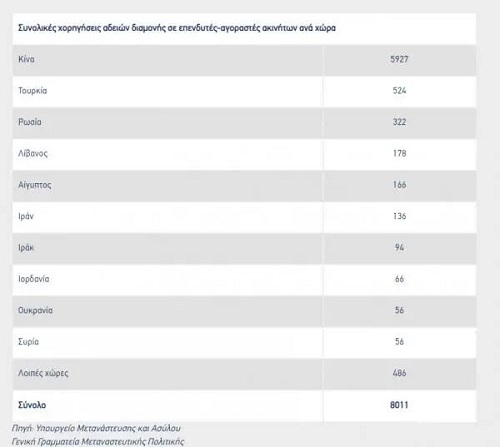 希臘移民與庇護部移民政策總秘書處的最新數據顯示,自2013年“黃金簽證”政策出臺至今,共有8011名第三國投資者獲得希臘政府發放的居留許可證。