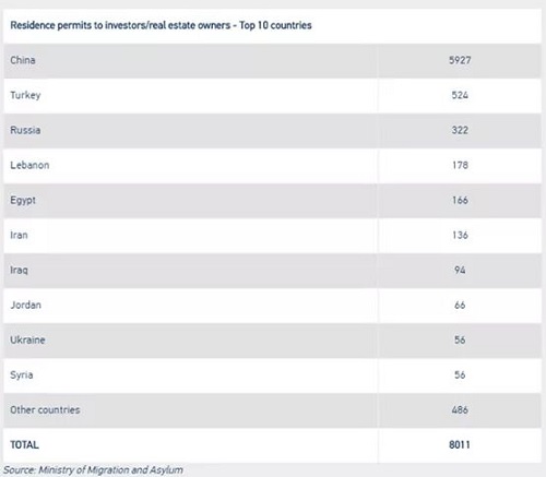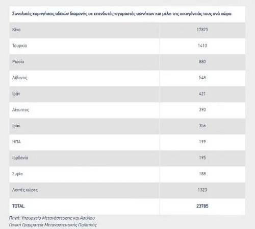 包括投資者的家庭成員在內,共有23785人通過“黃金簽證”計劃獲得了希臘政府發放的居留許可。其中中國17875人,土耳其有1410人,俄羅斯有880人,黎巴嫩有548人,伊朗有421人,埃及有390人,伊拉克有356人。