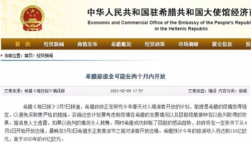 據《每日報》2月7日的報道,希臘政府有望從2021年4月1日起開放邊境,最晚將在5月2日東正教復活節之前對游客開放邊境。