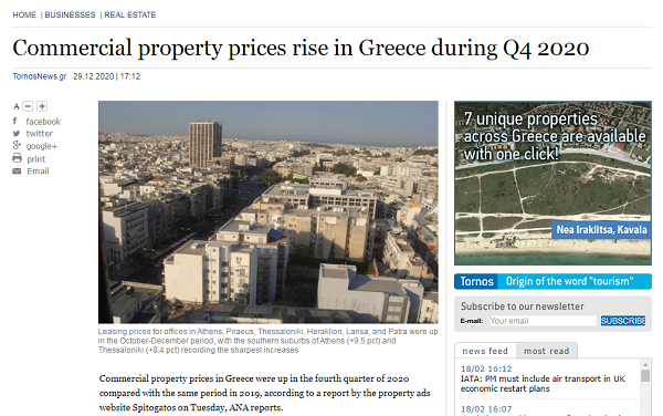 總體來說,希臘房地產市場在2020年仍保持積極的增長勢頭,繼第二季度和第三季度分別增長0.12%和0.9%后,據Spitogatos的房地產最新數據顯示,2020年第四季度希臘房產要價較2019年同期上漲2.7%。